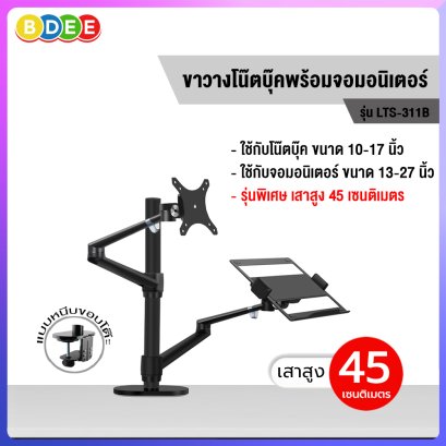 ขาวางโน๊ตบุ๊คพร้อมจอมอนิเตอร์ BDEE รุ่น LTS-311 แบบยึดขอบโต๊ะ (รุ่นเสาสูง 45 เซนติเมตร) ขาตั้งมี 2 แขน ใช้งานพร้อมกันได้ โดยสามารถวางโน๊ตบุ๊ค ขนาด 10-17 นิ้ว และสามารถติดจอมอนิเตอร์ขนาด 14-27 นิ้วได้ วัสดุเป็นอลูมิเนียมอัลลอยอย่างดี สามารถเลื่อนระดับแขนขึ้นลง ส่ายซ้ายขวา ยืดหดได้ รวมถึงปรับก้ม-เงย และหมุนได้ 360 องศา รูปทรงสวยงาม งานปราณีต เรียบร้อย ทำให้เป็นระเบียบ และประหยัดพื้นที่บนโต๊ะทำงาน