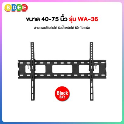 ขาแขวนที่วี BDEE รุ่น WA-36 เป็นขาแขวนทีวีติดผนัง แบบปรับก้มได้ ใช้กับทีวีขนาด 40-75 นิ้ว ทุกรุ่นทุกยี่ห้อ รับน้ำหนักได้ไม่เกิน 60 กิโลกรัม รองรับรูหลังทีวี แนวตั้งไม่เกิน 40 ซ.ม. และแนวนอนไม่เกิน 60 ซ.ม. ห่างจากผนัง 3.7 ซ.ม.เหล็กหนา 1.6 มิลลิเมตร น้ำหนักสินค้า 1.9 กิโลกรัม