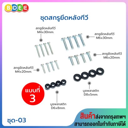 ชุดสกรูยึดหลังทีวี BDEE ชุด 02 เป็นชุดสกรูยึดหลังทีวีทีมีขนาดเล็ก ไปจนถึงทีวีที่มีขนาดกลาง สกรูยึดขาแขวนทีวีสามารถรองรับทีวีได้ทุกรุ่น ทุกยี่ห้อ