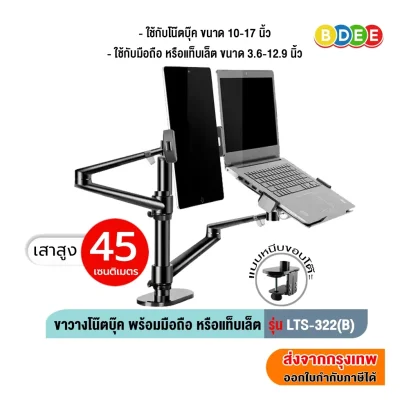 ขาตั้งโน๊ตบุ๊คพร้อมแท็บเล็ตหรือมือถือ BDEE รุ่น LTS-322 แบบยึดขอบโต๊ะ (รุ่นเสาสูง 45 เซนติเมตร) ขาตั้งมี 2 แขน ใช้งานพร้อมกันได้ โดยสามารถวางโน๊ตบุ๊ค ขนาด 10-17 นิ้ว และสามารถจับมือถือหรือแท็บเล็ต ขนาด 4-12.9 นิ้วได้ วัสดุเป็นอลูมิเนียมอัลลอยอย่างดี สามารถเลื่อนระดับแขนขึ้นลง ส่ายซ้ายขวา ยืดหดได้ รวมถึงปรับก้ม-เงย และหมุนได้ 360 องศา รูปทรงสวยงาม งานปราณีต เรียบร้อย ทำให้เป็นระเบียบ และประหยัดพื้นที่บนโต๊ะทำงาน