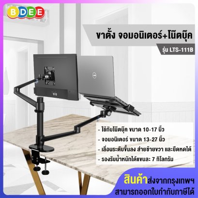 ขาวางโน๊ตบุ๊คพร้อมจอมอนิเตอร์ BDEE รุ่น LTS-111 (สีดำ) แบบยึดขอบโต๊ะ ขาตั้งมี 2 แขน ใช้งานพร้อมกันได้ โดยสามารถวางโน๊ตบุ๊ค ขนาด 10-17 นิ้ว และสามารถติดจอมอนิเตอร์ขนาด 14-27 นิ้วได้ วัสดุเป็นอลูมิเนียมอัลลอยอย่างดี สามารถเลื่อนระดับแขนขึ้นลง ส่ายซ้ายขวา ยืดหดได้ รวมถึงปรับก้ม-เงย และหมุนได้ 360 องศา รูปทรงสวยงาม งานปราณีต เรียบร้อย ทำให้เป็นระเบียบ และประหยัดพื้นที่บนโต๊ะทำงาน น้ำหนักสินค้า 5.3 กิโลกรัม