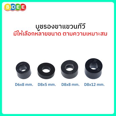 BDEE บูชรองขาแขวนทีวี ใช้กับสกรูขนาด 4-8 mm. เป็นบูชสำหรับรองขาแขวนทีวี ในกรณีไม่ต้องการให้ขาแขวนทีวีกระทบกับหลังทีวีโดยตรง เพื่อกันหลังทีวีเป็นรอย หรือรูด้านหลังของทีวีที่ต่างระดับกัน และยังสามารถใช้ในกรณีที่สกรูยึดหลังทีวียาวเกินไป สินค้าผลิตจากพลาสติกแข็งสีดำ ใน 1 ชุดจะมี 4 ตัว