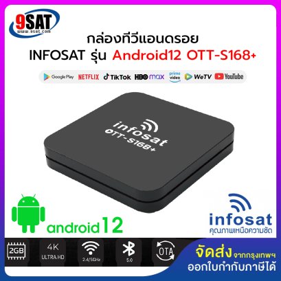 กล่องรับสัญญาณแอนดรอยทีวี INFOSAT Android12 รุ่น OTT-S168+ เป็นกล่องรับสัญญาณอินเตอร์เน็ต ใช้ระบบปฎิบัติการแอนดรอย เวอร์ชั่น 12 ซีพียูแบบ Quadcore แรม 2 Gb. รอม 16 Gb. รองรับระบบภาพแบบ 4K มาพร้อมช่องรายการไทย INFOSAT TV และช่องรายการต่างประเทศ ASIA TV อัดแนนประสิทธิภาพในการโหลดแอพจาก Play Store กว่า 1000 แอพ