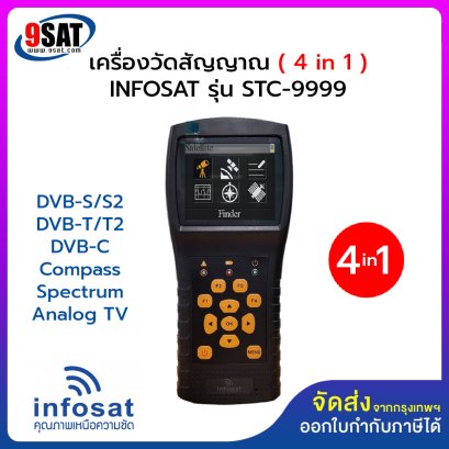 เครื่องวัดสัญญาณ 4 in 1 INFOSAT รุ่น STC-9999 เป็นเครื่องวัดสัญญาณจานดาวเทียม ระบบ C-Band และระบบ KU-Band (S2) รวมถึงวัดสัญญาณระบบเสาดิจิตอล (T2) , ระบบเคเบิ้ลทีวี (CATV) และระบบอนาล็อคทีวี (ATV) รองรับความถี่ OTA, ค่า LNB ทุกรุ่น ทุกยี่ห้อ แสดงค่ากราฟฟิคสเปคตรัม และมีเสียงแจ้งระดับสัญญาณ
