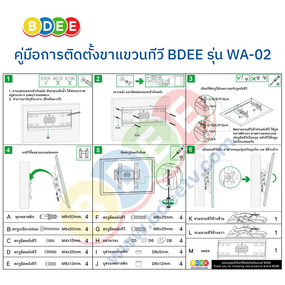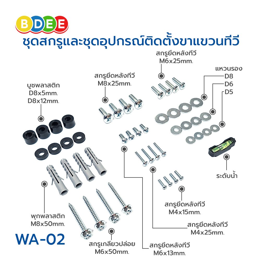 - มีระดับน้ำ และชุดอุปกรณ์สำหรับการติดตั้ง รวมถึงน็อตยึดหลังทีวีให้ทุกรุ่น ทุกยี่ห้อ