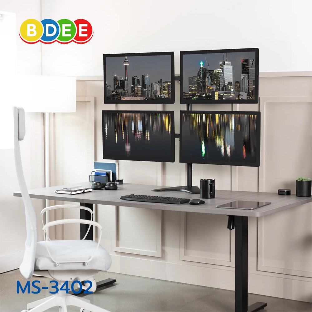 ขาตั้งจอมอนิเตอร์ 4 จอ BDEE รุ่น MS-3402 แบบวางบนโต๊ะ สามารถติดจอมอนิเตอร์ขนาด 13-27 นิ้ว ได้ 4 จอ (ด้านบน 2 จอ ด้านล่าง 2 จอ) ทุกรุ่น ทุกยี่ห้อ ที่มีรูยึดหลังจอมอนิเตอร์ ขนาดไม่เกิน 10x10 ซ.ม. วัสดุเป็นเหล็กพ่นสีอบความร้อนอย่างดี (Powder Coating) สามารถเลื่อนระดับแขนขึ้นลง ส่ายซ้ายขวา ยืดหดได้ รวมถึงปรับจอก้ม-เงย และหมุนหน้าจอได้ รูปทรงสวยงาม งานปราณีต เรียบร้อย ทำให้เป็นระเบียบประหยัดพื้นที่บนโต๊ะทำงาน