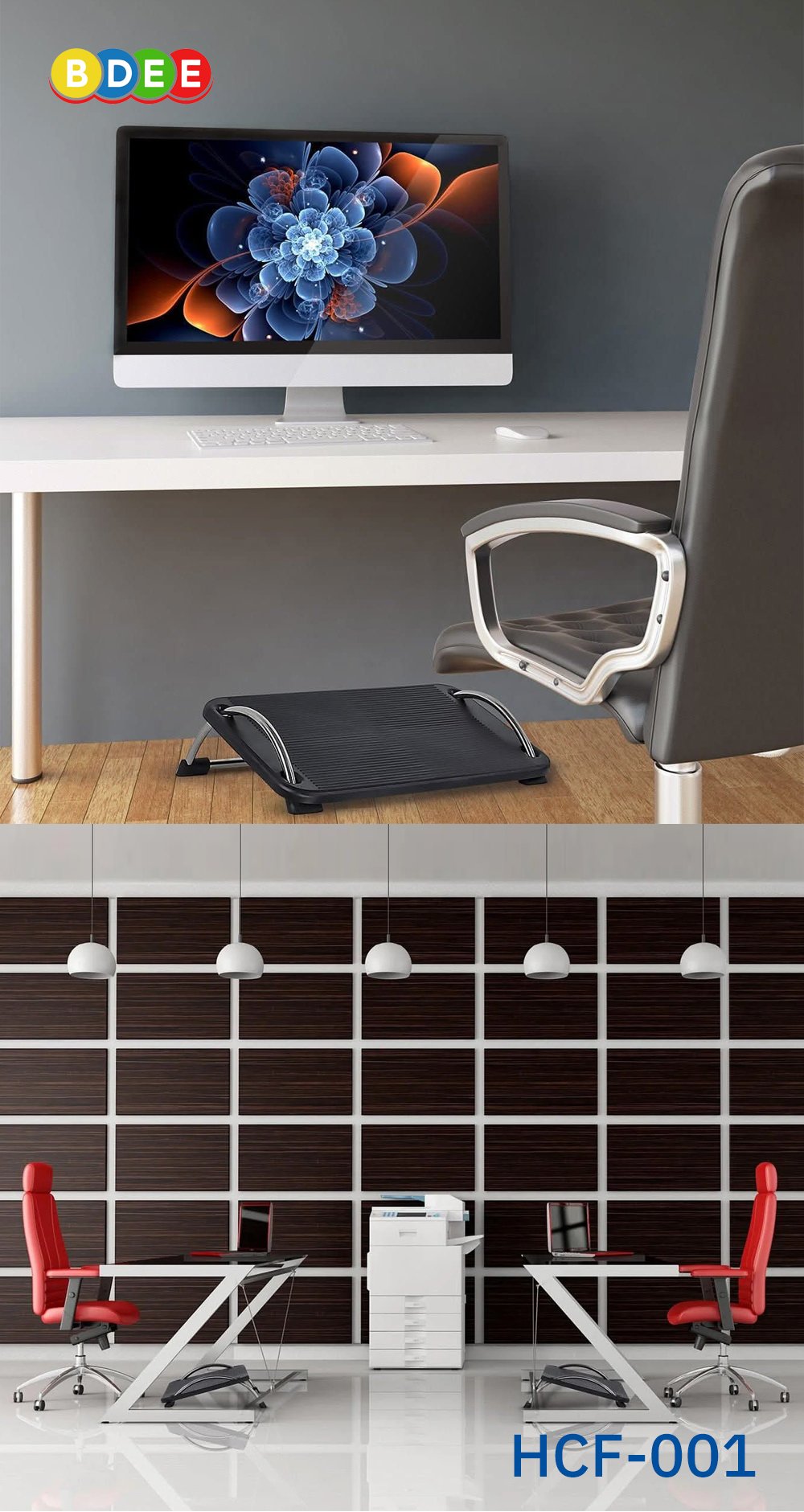 แท่นวางเท้าเพื่อสุขภาพ BDEE รุ่น HCF-001 เป็นอุปกรณ์ที่ปรับเปลี่ยนองศา และเปลี่ยนสรีระการวางเท้า เพื่อผ่อนคลายความเมื่อยล้า และยังลดอาการเกร็ง ของข้อเท้า, ขา และหลัง สินค้าผลิตจากพลาสติก ABS อย่างดี เสริมโครงที่ผลิตจากสแตนเลส แข็งแรง สวยงาม และไม่เป็นสนิม
