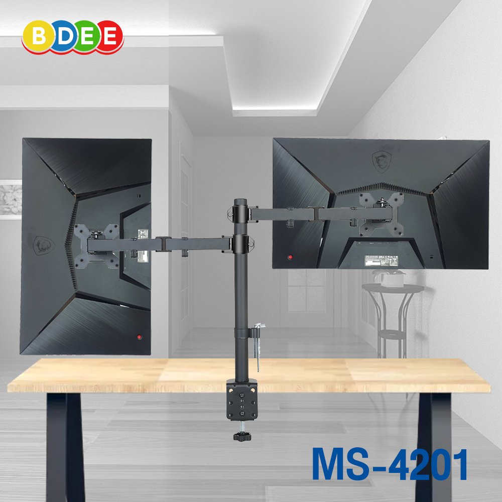 ขาตั้งจอมอนิเตอร์ 2 จอ BDEE รุ่น MS-4201 (แขนต่างระดับ) แบบยึดขอบโต๊ะ สามารถติดจอมอนิเตอร์ขนาด 13-32 นิ้ว ได้ทุกรุ่น ทุกยี่ห้อ ที่มีรูยึดหลังจอมอนิเตอร์ ขนาดไม่เกิน 10x10 ซ.ม. รุ่นนี้แขนจะต่างระดับกัน เหมาะสำหรับจอมอนิเตอร์คนละรุ่น คนละยี่ห้อ ที่มีรูยึดหลังจอฯ คนละระดับ จะสามารถปรับหน้าจอให้เท่ากันได้ วัสดุเป็นเหล็กพ่นสีอบความร้อนอย่างดี (Powder Coating) สามารถเลื่อนระดับแขนขึ้นลง ส่ายซ้ายขวา ยืดหดได้ รวมถึงปรับจอก้ม-เงย และหมุนหน้าจอได้ รูปทรงสวยงาม งานปราณีต เรียบร้อย ทำให้เป็นระเบียบประหยัดพื้นที่บนโต๊ะทำงาน