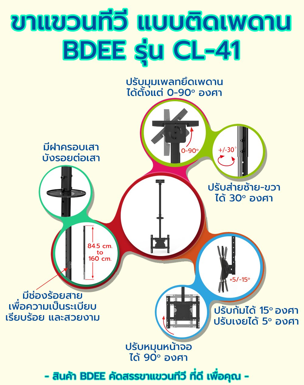 ขาแขวนทีวี BDEE รุ่น CL-41 เป็นขาแขวนทีวีสำหรับติดเพดาน แบบ 1 จอ เสายาว 84.5-160 ซ.ม. ฐานยึดเสาออกแบบมาให้สามารถติดกับผนังหรือคานได้ด้วย สามารถปรับก้ม-เงย ส่ายซ้าย-ขวา และหมุนหน้าจอเป็นแนวตั้งหรือแนวนอนได้เลย โดยไม่ต้องยกจอออก เหมาะสำหรับใช้กับทีวี ขนาด 40-65 นิ้ว ทุกรุ่น ทุกยี่ห้อ รูปทรงสวยงาม เหล็กหนา แข็งแรง ทนทาน เคลือบด้วยสีฝุ่นอบความร้อนอย่างดี