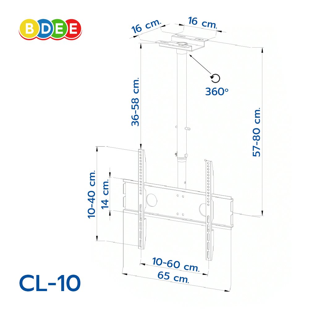ขาแขวนทีวี BDEE รุ่น CL-10 เป็นขาแขวนทีวีสำหรับติดเพดาน สามารถปรับก้มได้ 20 องศา หมุนซ้าย-ขวาได้ 360 องศา รองรับทีวีแบบ OLED, QLED, UHD, Smart TV, LED ขนาด 32-75 นิ้ว ได้ทุกรุ่นทุกยี่ห้อ สวยงาม เหล็กหนา แข็งแรง ทนทาน เคลือบด้วยสีฝุ่นอบความร้อนอย่างดี