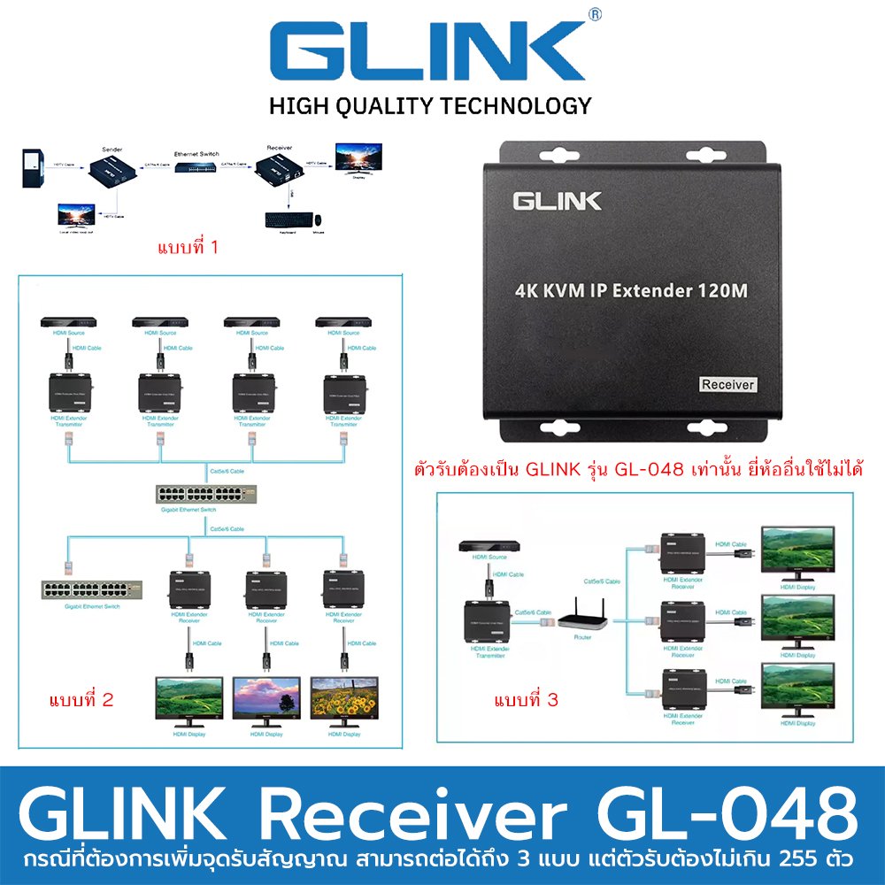 GLINK HDMI EXTENDER OVER IP HDTV (120 เมตร) รุ่น GL-048 อุปกรณ์แปลงสัญญาณภาพ HDMI ผ่านสายแลนระยะไกล (ทางร้านแนะนำเป็นสายแลน Cat6 ที่ไม่ใช่สายแลนแบบสำเร็จรูป) ในระยะไม่เกิน 120 เมตร ตัวอุปกรณ์สามารถใช้งานร่วมกับคีย์บอร์ด และเม้าส์ ที่ปลายทางได้ (มีช่องเสียบ USB) และสามารถใช้งานควบคู่ผ่านระบบเน็ตเวิร์ค (HUB) ได้ ช่วยแก้ปัญหาเรื่องข้อจำกัดของการเดินสาย HDMI ยาว ๆ ที่สาย HDMI (ทองแดง) ไม่สามารถส่งสัญญาณระยะไกลได้ ส่วนสาย HDMI FIBER ก็มีราคาแพง และสายมีโอกาสเสียหายได้ อีกทั้งสายแลนยังมีขนาดเล็ก ทำให้การเดินสายระยะไกลเป็นเรื่องที่ง่ายและสะดวกกว่า