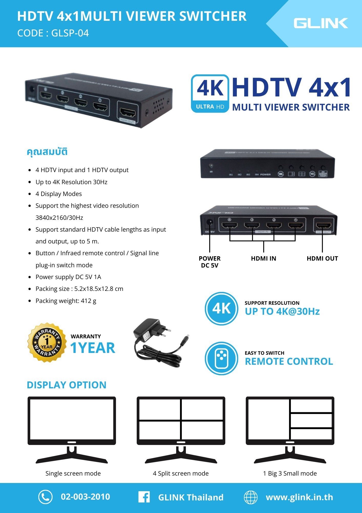 Glink HDMI Multi Viewer Switch 4K@30Hz (เข้า 4 ออก 1) รุ่น GLSP-04 เป็นอุปกรณ์สลับสัญญาณภาพ หรือรวมสัญญาณภาพ จาก 4 แหล่งสัญญาณภาพ ไปยัง 1 จอภาพ แสดงผลภาพแบบ HDMI มี 3 โหมดการแสดงผล รองรับระยะสาย HDMI ฝั่ง Input และฝั่ง Output ได้ 5 เมตร ควบคุมการทำงานได้จากปุ่มกด และรีโมท มีไฟ LED แสดงสถานะด้านหน้าเครื่อง ใช้งานได้ง่าย เป็นแบบ Plug & Play เพียงแค่เสียบสาย ไม่ต้องลง Driver ใดๆ ทั้งสิ้น