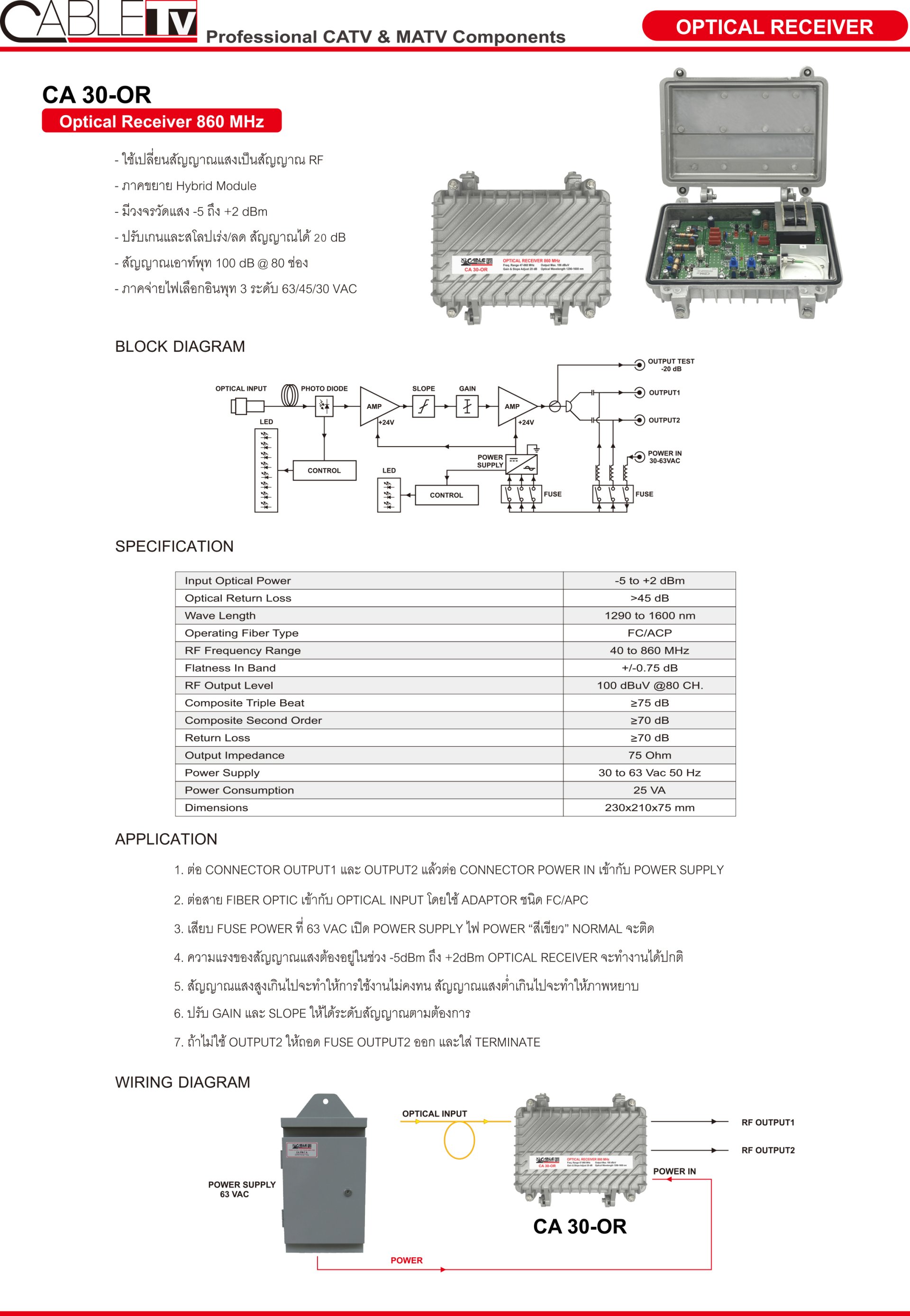 Optical Receiver CABLE รุ่น CA 30-OR (OUTDOOR) นวัตกรรมใหม่ของการรับสัญญาณ RF ผ่านระบบ Fiber Optic ซึ่งไม่ต้องง้อสาย RG-6 สามารถเดินสายได้ไกลเป็นกิโลเมตร หรือระหว่างตึกโดยสัญญาณไม่ตก ไม่กวนสัญญาณ เหมาะสำหรับ โรงแรมขนาดใหญ่ รีสอร์ทขนาดใหญ่ โดยเปลี่ยนสัญญาณแสง เป็นสัญญาณ RF รองรับความถี่ RF (40-860 MHz) ซึ่งสัญญาณแสงมีความยาวคลื่น 1290-1600 nm. สามารถปรับเกณฑ์และสโลป เร่งหรือลดสัญญาณRF ได้ 20 dB. มีภาคขยายสัญญาณในตัวแบบ Hybid Module โดยมี RF Output สูงถึง 100 dBuV @80 ช่อง เหมาะสำหรับแยกระบบเข้าในตึก 30-60 จุด ภาคจ่ายไฟเลือกอินพุท 3 ระดับ 63/45/30 VAC (ต้องใช้ควบคู่กับตู้จ่ายไฟ)
