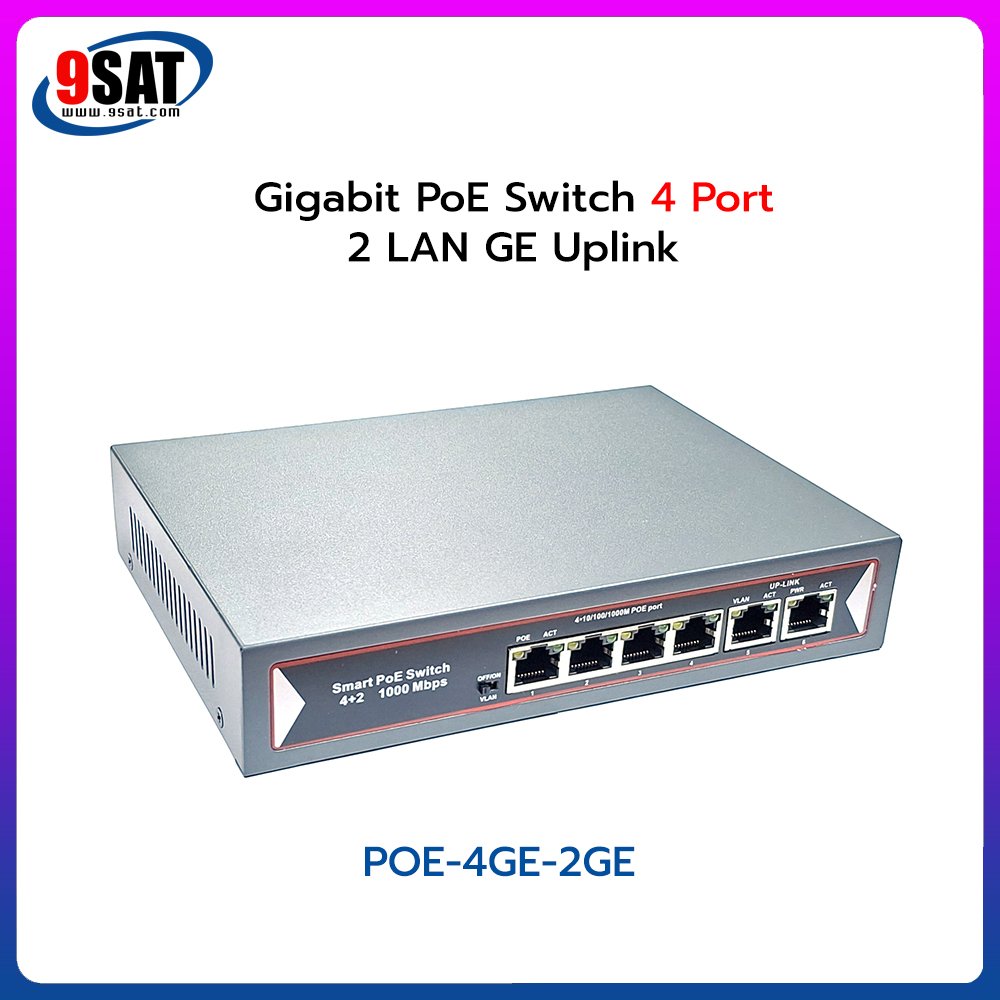 Gigabit PoE Switch 4 Port + 2 LAN GE Uplink เป็นอุปกรณ์รับ-ส่งข้อมูลจำนวนช่องสัญญาณ 4 Port และจ่ายไฟไปในสายพร้อมกัน (48V.) มาตรฐาน ieee802.3af/at รองรับการใช้งานร่วมกับกล้องวงจรปิดแบบ IP-Camera ทุกยี่ห้อ รวมถึง Access Point และอุปกรณ์อื่นๆ ที่รองรับระบบ Power over Ethernet (PoE) ในตัว ระยะในการจ่ายไฟผ่านสายแลน และ Data ที่ระยะ 100 เมตร โดยสายแลนแบบ Cat5E, Cat6 สิ่งที่พิเศษสำหรับอุปกรณ์รุ่นนี้ รองรับการใช้งาน Vlan Dip Switch โดยลักษณะการทำงานจะเป็น Isolate port โดยแต่ละ Port ไม่สามารถทำให้มองเห็นกัน ช่วยเรื่องการฟุ้งกระจายของ Data ได้ดีเยี่ยม