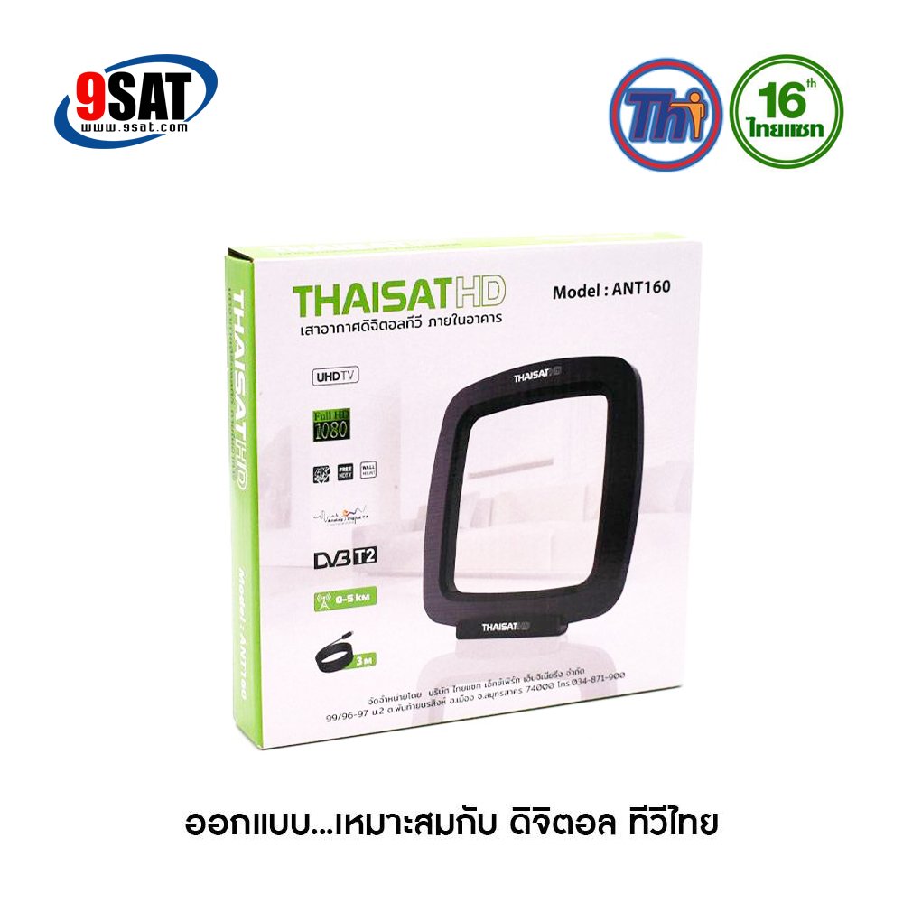 เสาอากาศดิจิตอลทีวี ภายในบ้าน THAISAT HD รุ่น ANT160 เป็นเสาอากาศที่ใช้สำหรับรับสัญญาณทีวีดิจิตอล แบบภายในบ้าน เพียงนำมาต่อเข้าหลังทีวีรุ่นใหม่ ที่มีดิจิตอลทีวีในตัว ทุกรุ่น ทุกยี่ห้อ ไม่ต้องเปิดไฟเลี้ยง ไม่ต้องอาศัยช่างติดตั้ง สามารถปรับขยับหาสัญญาณเองให้ดีที่สุด ก็สามารถรับชมรายการได้