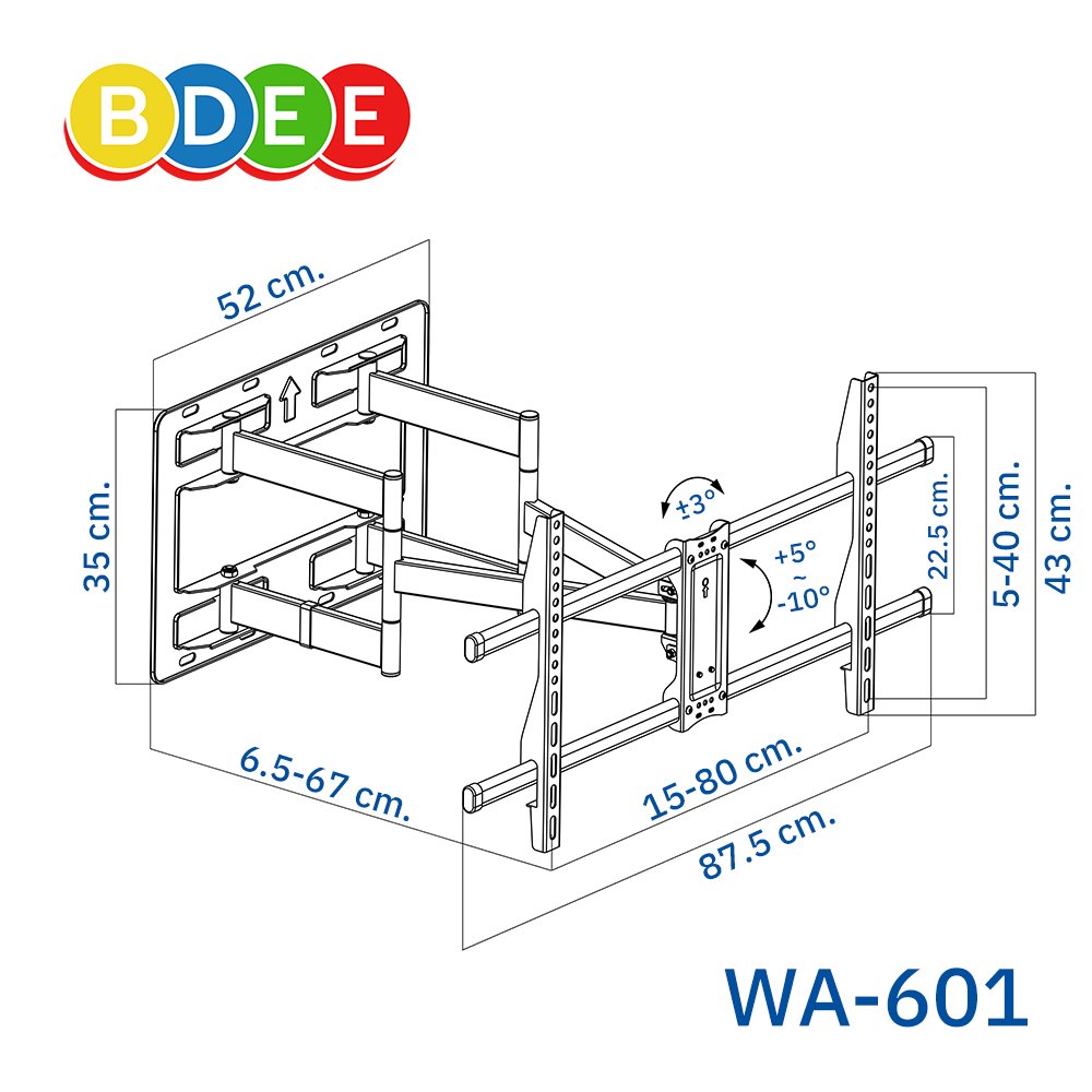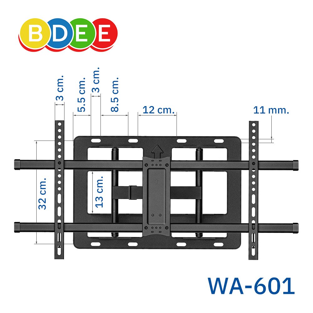ขาแขวนทีวี BDEE รุ่น WA-601 เป็นขาแขวนทีวีแบบ 2 แขน มีเพลทหลังขนาดใหญ่ เหมาะกับทีวี ขนาดตั้งแต่ 40-85 นิ้ว สามารถยืดออกได้ไกลถึง 67 ซ.ม.
