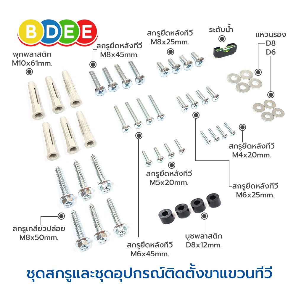 สกรูสำหรับยึดทีวี | M4 x 20 ม.ม. , M5 x 20 ม.ม.M6 x 25 ม.ม. , M6 x 45 ม.ม.M8 x 25 ม.ม. , M8 x 45 ม.ม. |